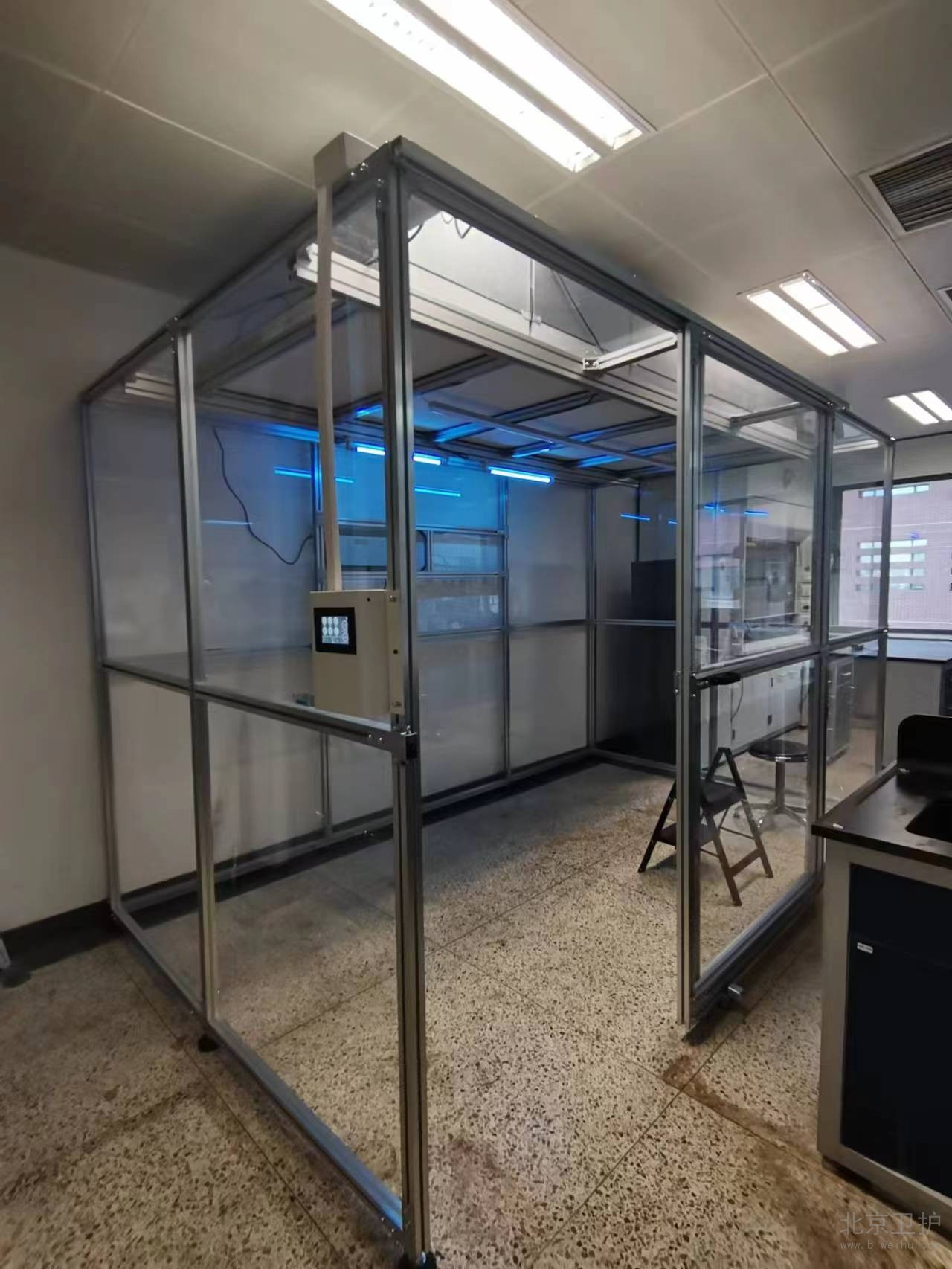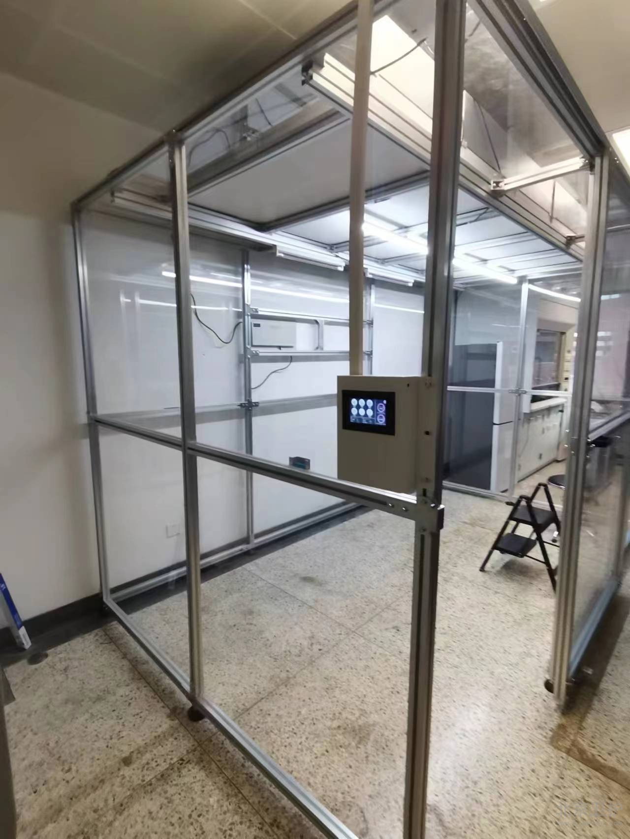 9月份我公司接到此項目后便抓緊時間出具相關方案、設計圖紙,經(jīng)過不斷的溝通和改動,最終確定施工方案。此單位潔凈棚設計面積20平米,主體材質(zhì)為鋁型材,隔離板使用亞格力板,頂部配有紫外線燈輔助殺菌,過濾系統(tǒng)為百級凈化模塊,并配有我公司研發(fā)的控制系統(tǒng)。從最初的方案設計、安裝施工,到最后的驗收,總工期為10個工作日。