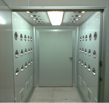 風淋室根據(jù)吹淋方式可分為:頂吹風淋室、單人單吹風淋室、單人雙吹風淋室、單人三吹風淋室、雙人雙吹風淋室、雙人三吹風淋室、多人雙吹風淋室、多人三吹風淋室、轉角風淋室。